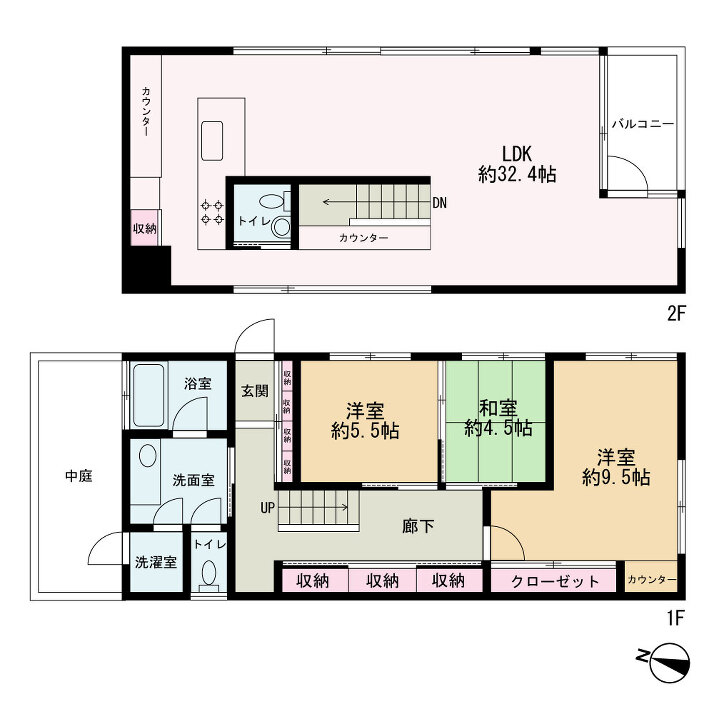洋室 9帖 x 1室、洋室 5.5帖 x 1室、和室 4.5帖 x 1室、LDK 32.4帖 x 1室