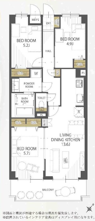 | 間取り | 3LDK LDK 13.6帖 x 1室、洋室 5.7帖 x 1室、洋室 5.2帖 x 1室、洋室 4.9帖 x 1室 |