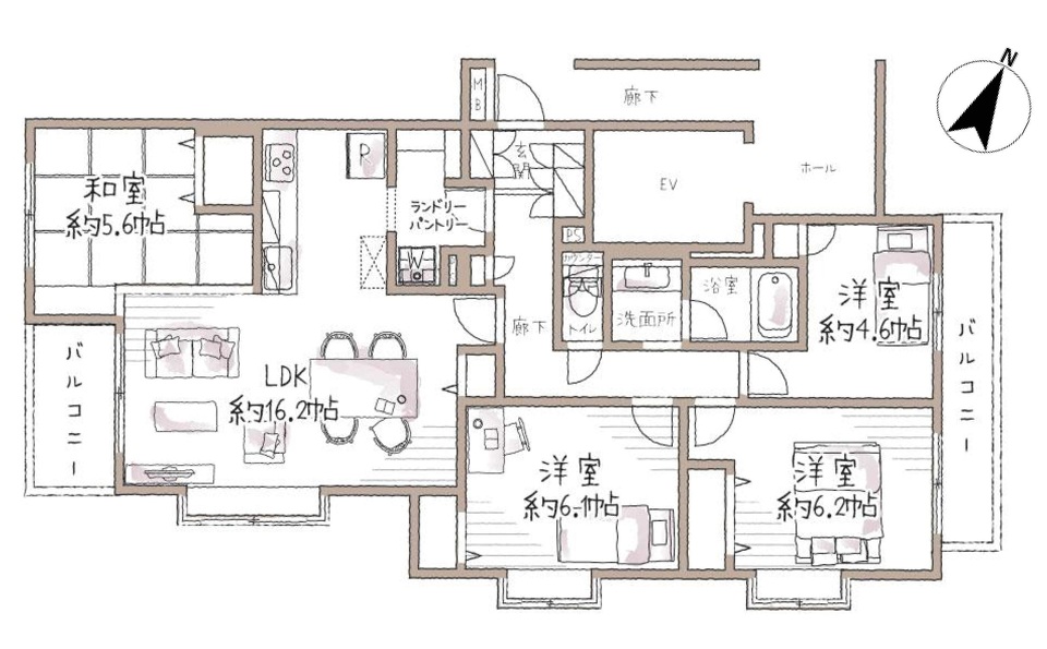 LDK 16.2帖 x 1室、洋室 6.2帖 x 1室、洋室 6.1帖 x 1室、和室 5.6帖 x 1室、洋室 4.6帖 x 1室
