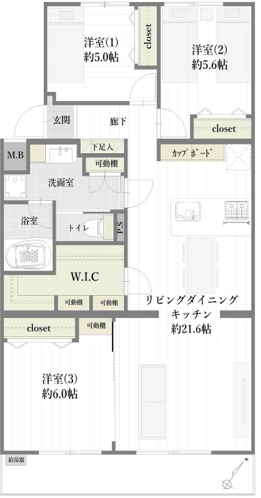 | 間取り | 3LDK LDK 21.6帖 x 1室、洋室 6帖 x 1室、洋室 5.6帖 x 1室、洋室 5帖 x 1室 |