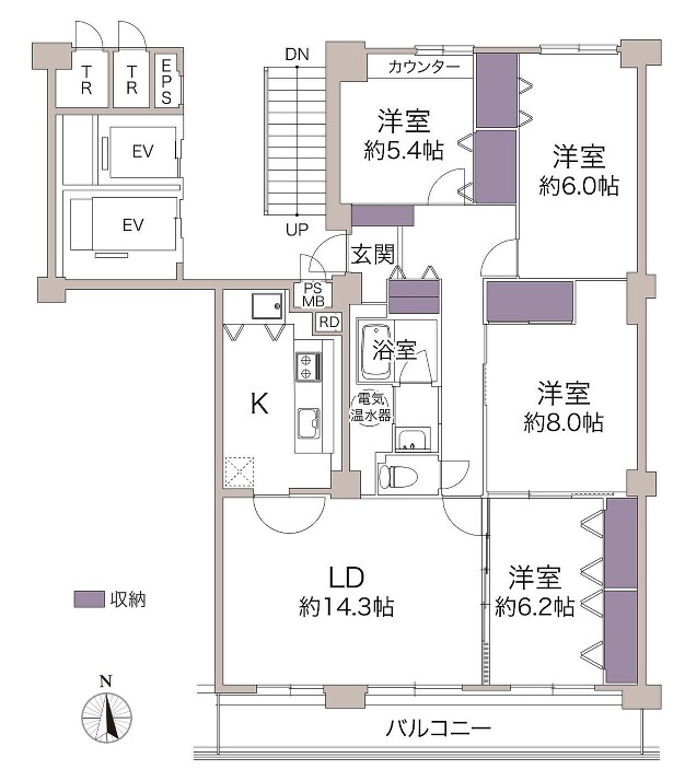 | 間取り | 4LDK LD 14.3帖 x 1室、洋室 8帖 x 1室、洋室 6.2帖 x 1室、洋室 6帖 x 1室、洋室 5.4帖 x 1室 |
