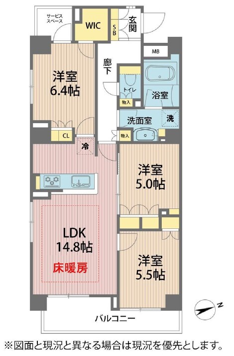 | 間取り | 3LDK LDK 14.8帖 x 1室、洋室 6.4帖 x 1室、洋室 5.5帖 x 1室、洋室 5帖 x 1室 |