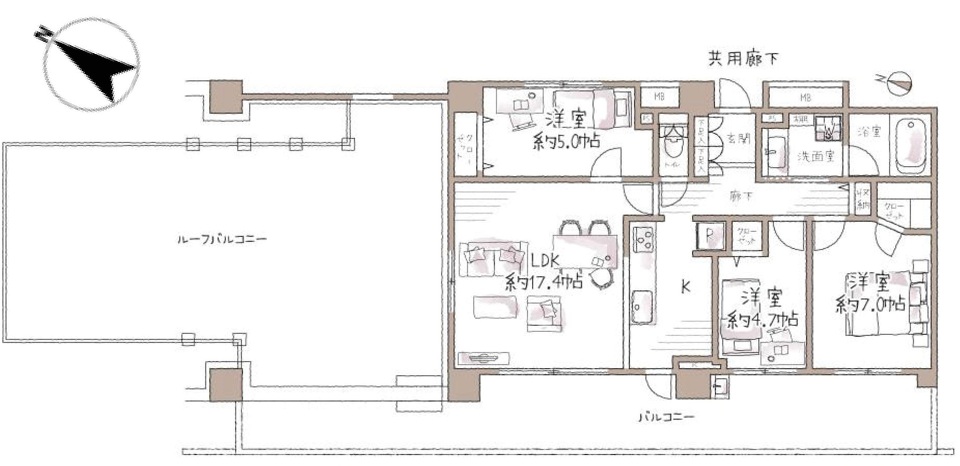 | 間取り | 3LDK LDK 17.4帖 x 1室、洋室 7帖 x 1室、洋室 5帖 x 1室、洋室 4.7帖 x 1室 |