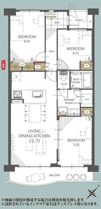 | 間取り | 3LDK LDK 15.7帖 x 1室、洋室 6.4帖 x 1室、洋室 5.9帖 x 1室、洋室 4.7帖 x 1室 |