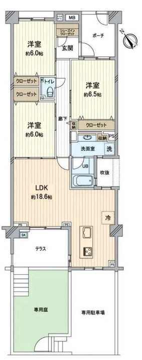 LDK 18.6帖 x 1室、洋室 6.5帖 x 1室、洋室 6帖 x 2室