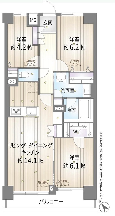 | 間取り | 3LDK LDK 14.1帖 x 1室、洋室 6.2帖 x 1室、洋室 6.1帖 x 1室、洋室 4.2帖 x 1室 |