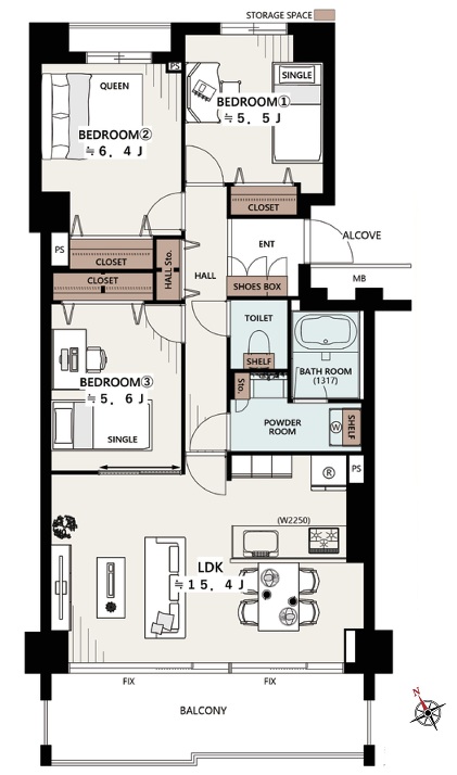 | 間取り | 3LDK LDK 15.4帖 x 1室、洋室 6.4帖 x 1室、洋室 5.6帖 x 1室、洋室 5.5帖 x 1室 |