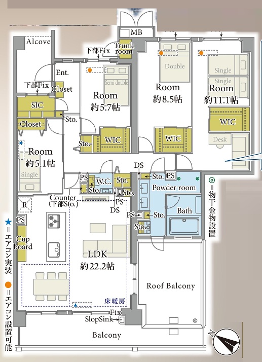 | 間取り | 4LDK LDK 22.2帖 x 1室、洋室 11.1帖 x 1室、洋室 8.5帖 x 1室、洋室 5.7帖 x 1室、洋室 5.1帖 x 1室 |
