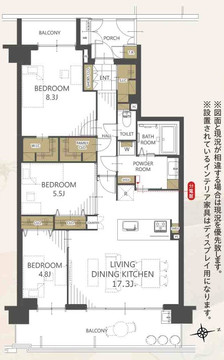 | 間取り | 3LDK LDK 17.3帖 x 1室、洋室 8.3帖 x 1室、洋室 5.5帖 x 1室、洋室 4.8帖 x 1室 |