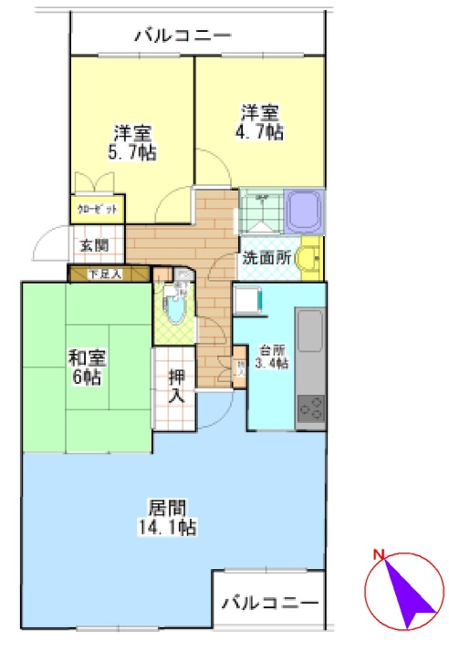 | 間取り | 3LDK LD 14.1帖 x 1室、K 3.4帖 x 1室、和室 6帖 x 1室、洋室 5.7帖 x 1室、洋室 4.7帖 x 1室 |