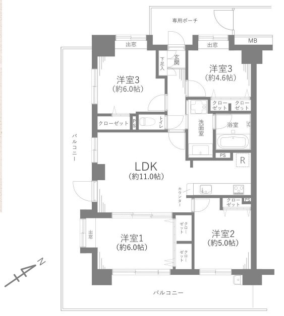 | 間取り | 4LDK LDK 11帖 x 1室、洋室 6帖 x 2室、洋室 5帖 x 1室、洋室 4.6帖 x 1室 |