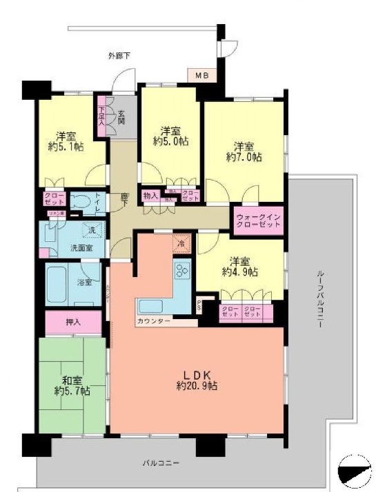 | 間取り | 5LDK LDK 20.9帖 x 1室、洋室 7帖 x 1室、洋室 5.1帖 x 1室、洋室 5帖 x 1室、洋室 4.9帖 x 1室、和室 5.7帖 x 1室 |