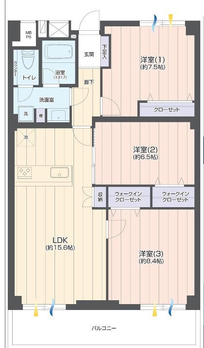 | 間取り | 3LDK LDK 15.6帖 x 1室、洋室 8.4帖 x 1室、洋室 7.5帖 x 1室、洋室 6.5帖 x 1室 |