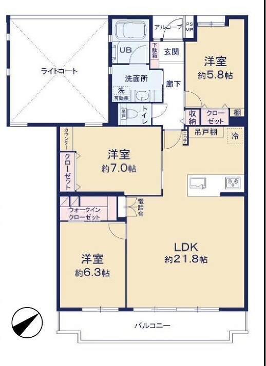 LDK 21.8帖 x 1室、洋室 7帖 x 1室、洋室 6.3帖 x 1室、洋室 5.8帖 x 1室