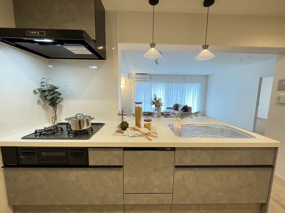 リビングを見渡しながら家事できる対面式キッチン お洒落なペンダントライトで気分も上がります
