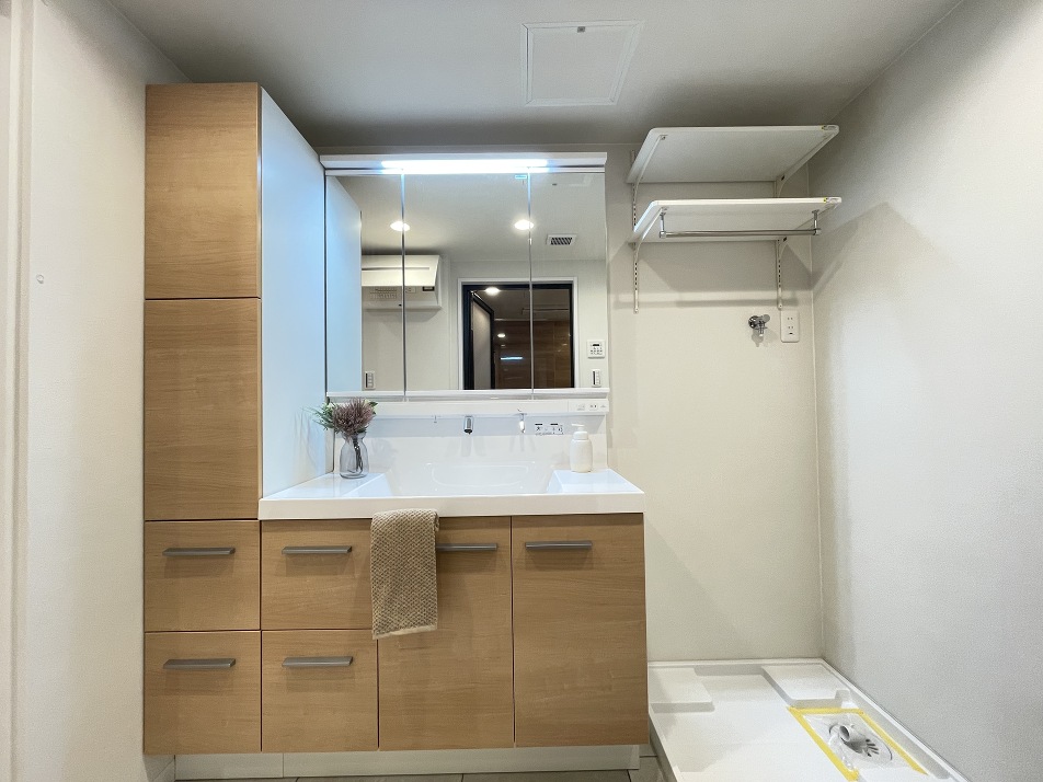 洗面化粧台 キャビネット付でリネン類などもすっきり収まります