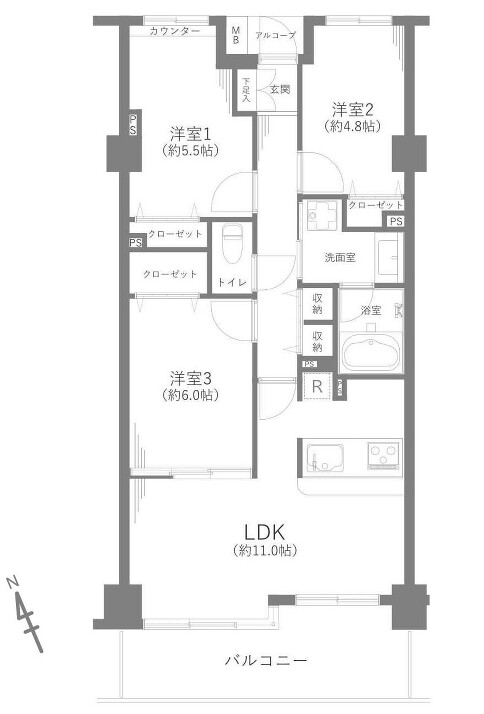 | 間取り | 3LDK LDK 11帖 x 1室、洋室 6帖 x 1室、洋室 5.5帖 x 1室、洋室 4.8帖 x 1室 |